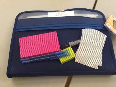 3. Pencil case for small tools like a mini-stapler, mini-scotch tape, wet or dry erase markers, small book rings, hole puncher, blank index cards, sticky notes, and a pen for writing conference notes.