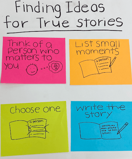 Along the way, you introduce your writers to different strategies within each part of the writing process. The right anchor chart focuses on the writing process’s generating portion. It introduces a single strategy students can use when generating ideas for a true story. While you teach using your anchor chart, it’s key that the words you use match what’s on the anchor chart. Example: Saying true stories on your chart but using the term ‘small moments’ while you demonstrate.