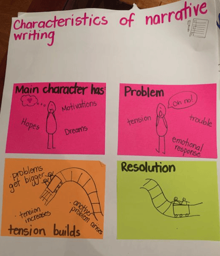 Genre charts highlight characteristics of a genre, such as topics, text features, structure, tone, and author’s purpose. You can make these charts during the immersion week when highlighting craft moves and techniques of a specific genre. The anchor chart to the right highlights the characteristics of narrative writing.